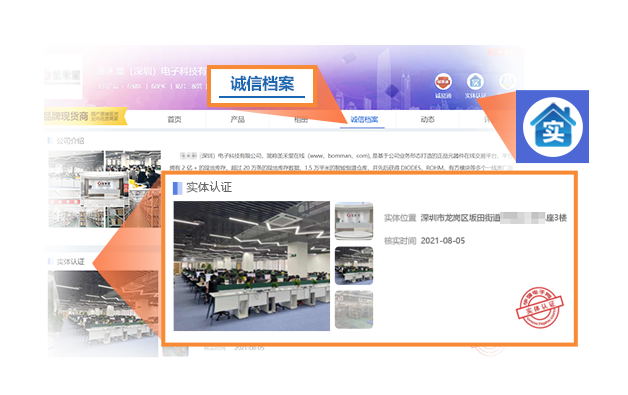 实体认证是多多28电子网付费会员的一项重要认证服务 ,在电子网IC搜索页、供应商搜索页、企业旺铺首页和诚信档案页等位置展示企业实体店铺的门头、办公环境、仓库等照片/视频等实体信息,增加被询盘的机会。